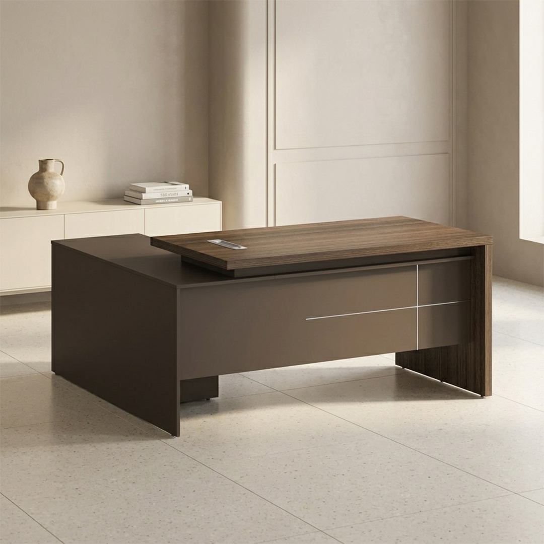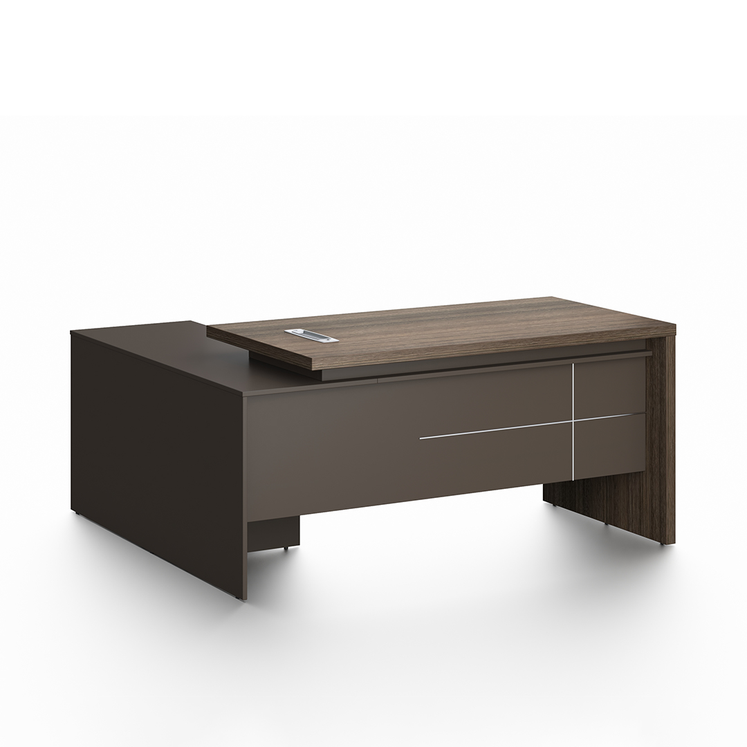 Finished in a sophisticated dual-tone combination — DA10 Rhine Oak and DB05 Iron Gray — this executive desk enhances any modern office interior with a luxury, contemporary touch.